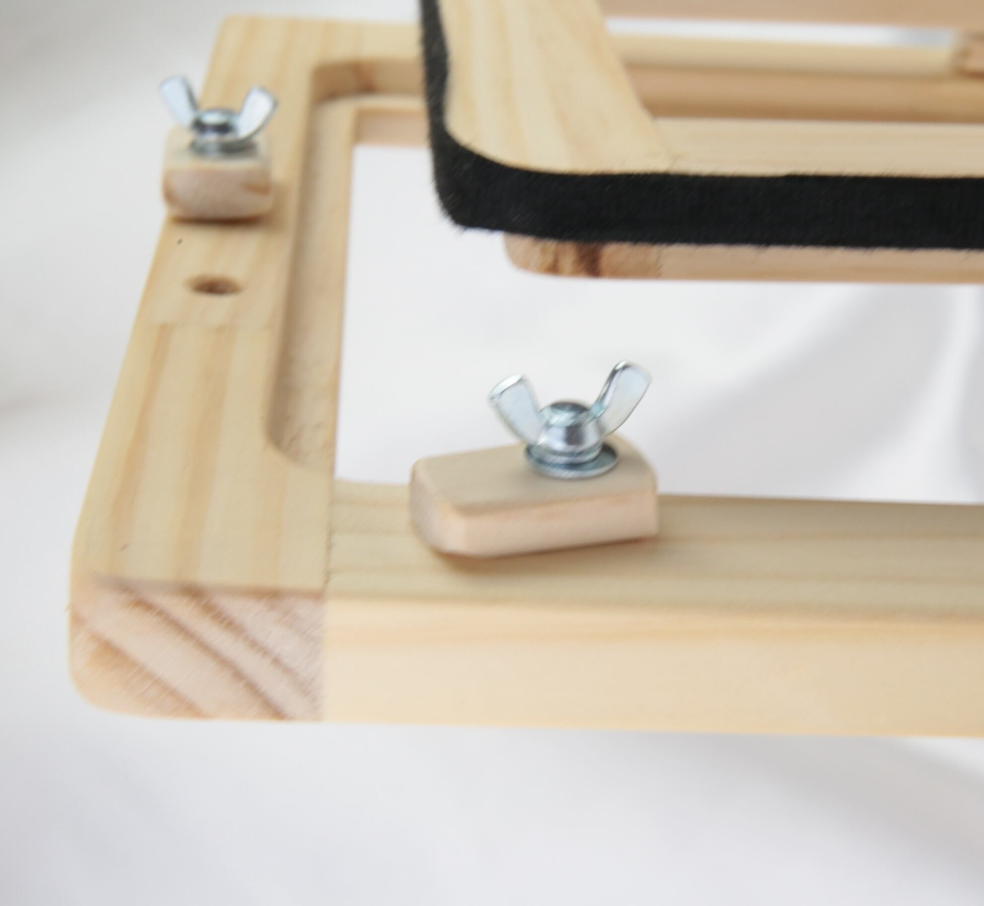 ①二つの枠で布をはさみ、ねじで締めるだけで